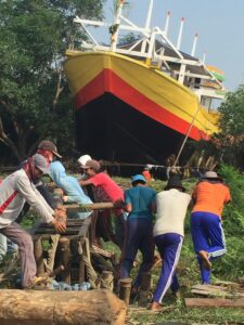 2007年頃になると氷ではなく冷凍設備を備えた木造漁船が誕生した。2013年に村を再訪したときには、大型の木造船の建造ラッシュを迎えており、カランソン村の入り口から海に向かう川岸や空き地に巨大な木造船建造中だった。その大きさ(積載量で)30GTだったのが、70GT、さらには今回(2025年)訪れたときには140GTという大型の船も生まれていた。わずか10年ほどの間に漁船の巨大化(積載量)が進んでいたのには驚いた。